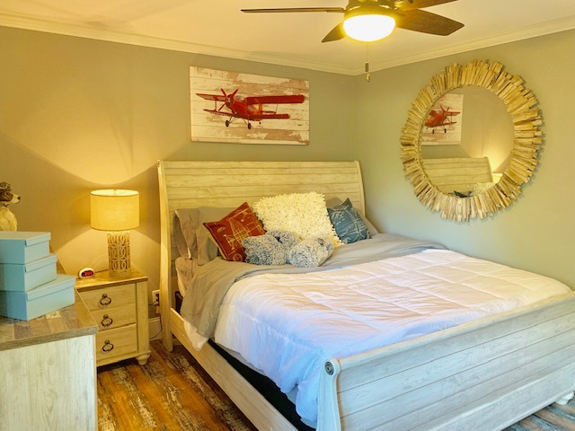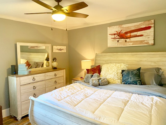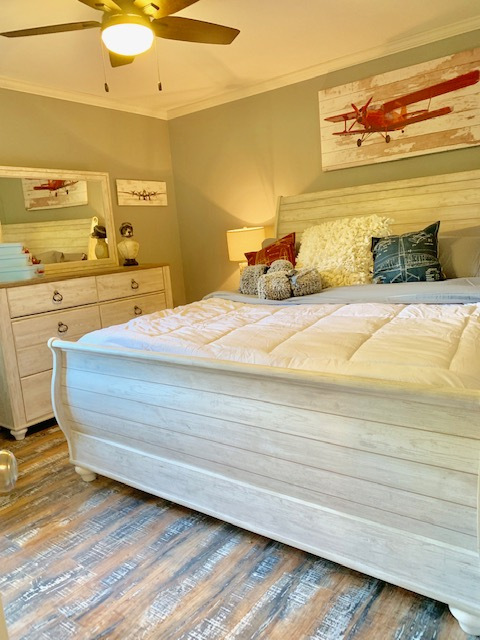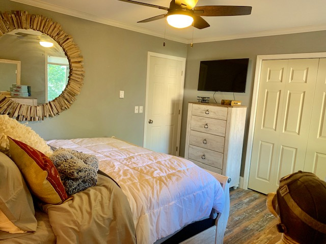 The single bedroom features a beautiful king bedroom set and an extra comfortable mattress, bamboo bed sheets, oversized driftwood mirror, cable/roku/flatscreen TV and ample closet space.