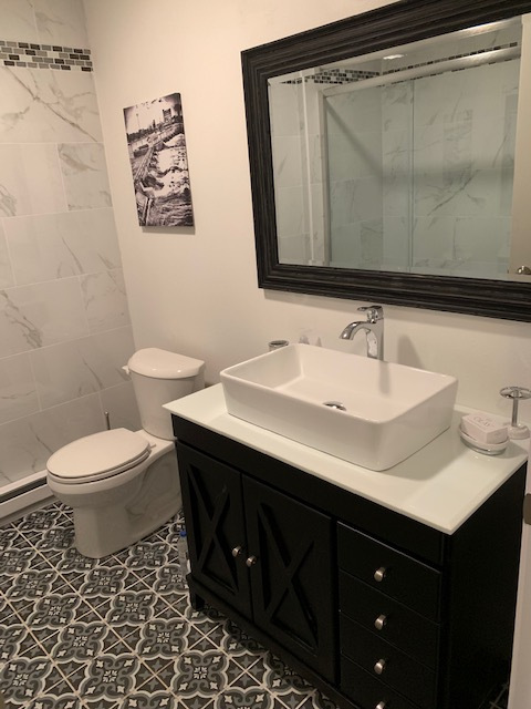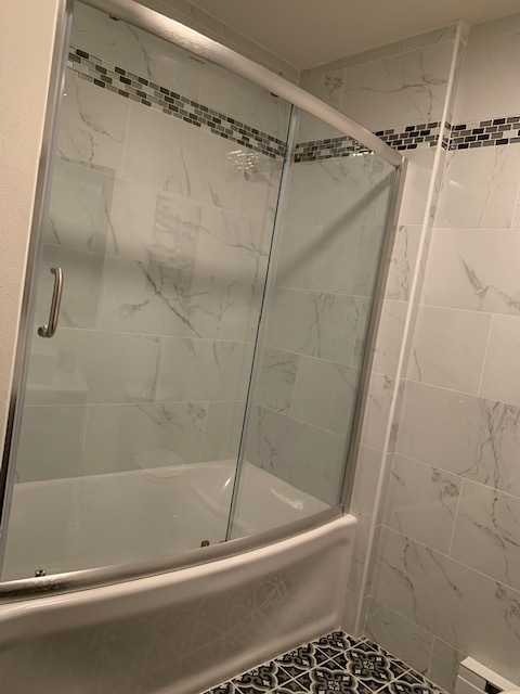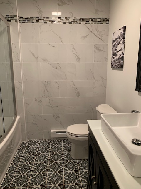 The brand new bathroom has a deep tub, great big gleaming shower head, sleek marble tile finishes, tile flooring, modern wide edge sliding shower door, and new vanity for an upgraded spa like bathroom.