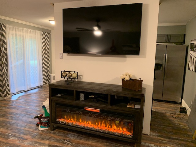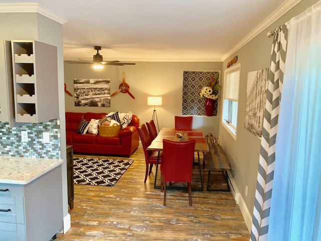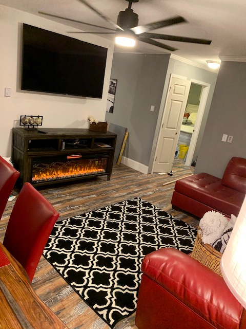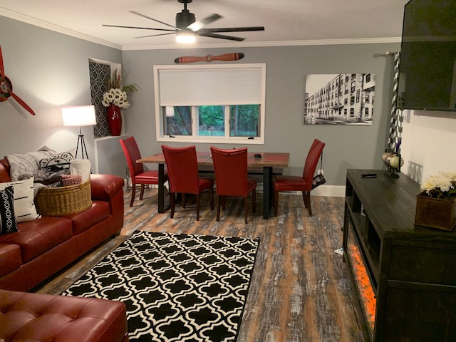 The living room features a large sectional couch and a huge live edge “Property Brothers” dining table that makes an amazing dining or work space while you enjoy a show on the 65 inch flatscreen TV and warm your toes by our 60″ wide executive electric fireplace. The fireplace features a range of settings providing warmth and various visual fire settings. Built in Air Conditioning is also featured throughout the unit. (Brand new double split system).