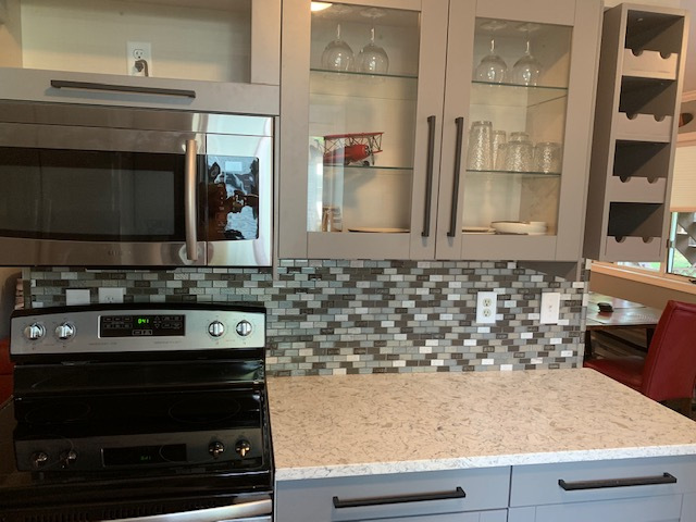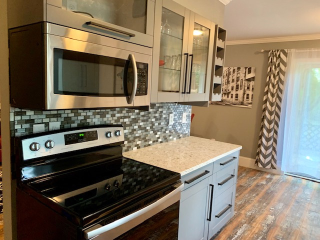 The kitchen features a mini bar for extra prep space, brand new slate grey cabinetry with glass windows, new dishwasher, a new large fridge with ice maker/water dispenser, over range microwave, and quartz countertops.
