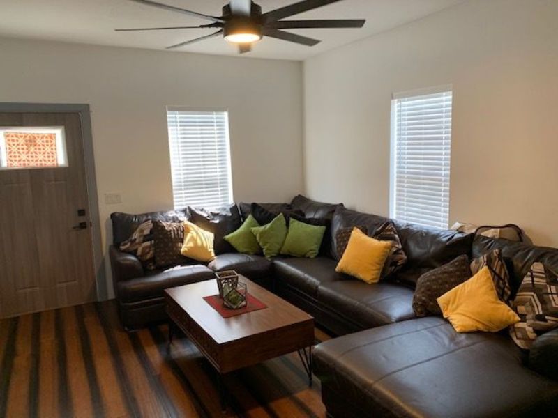 Living room is an open concept design looking into the kitchen with a large sectional couch, tile and brickwork details, flatscreen TV and all the upgrades.