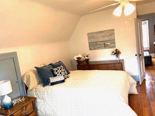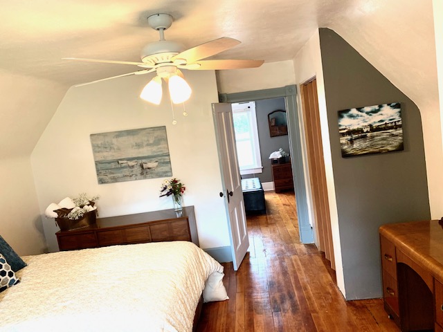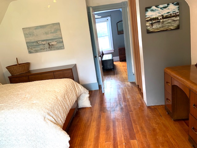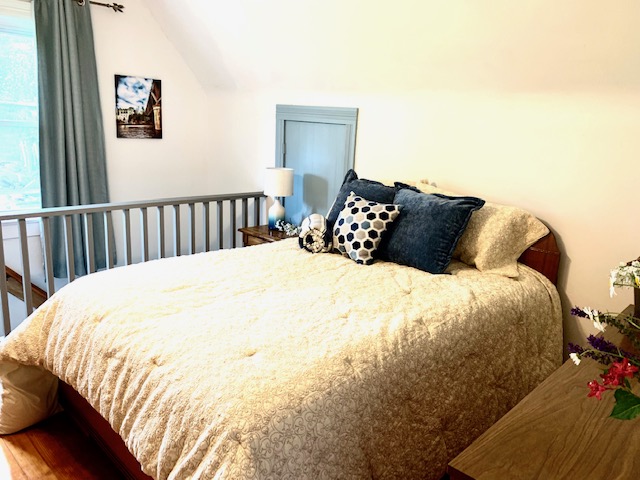 Upstairs has two bedrooms, but layout requires you to walk through first bedroom in order to enter the second, making this less ideal for two separate parties who each require a great deal of privacy. Queen bed and full bed sets in the upper bedrooms.